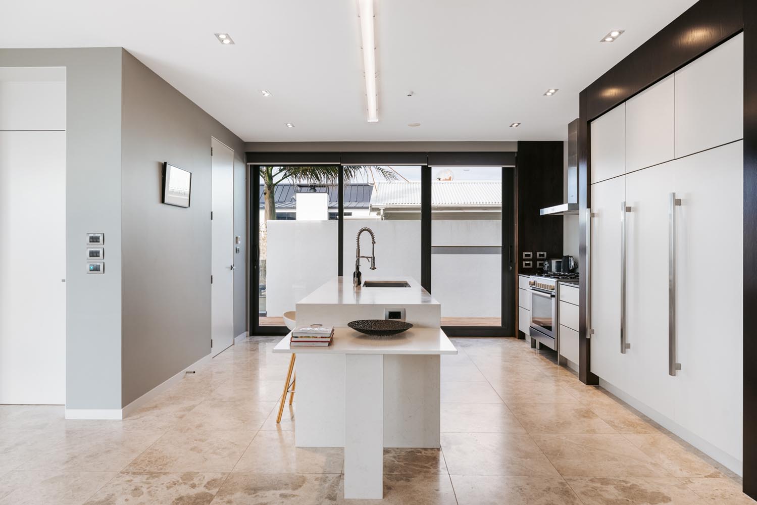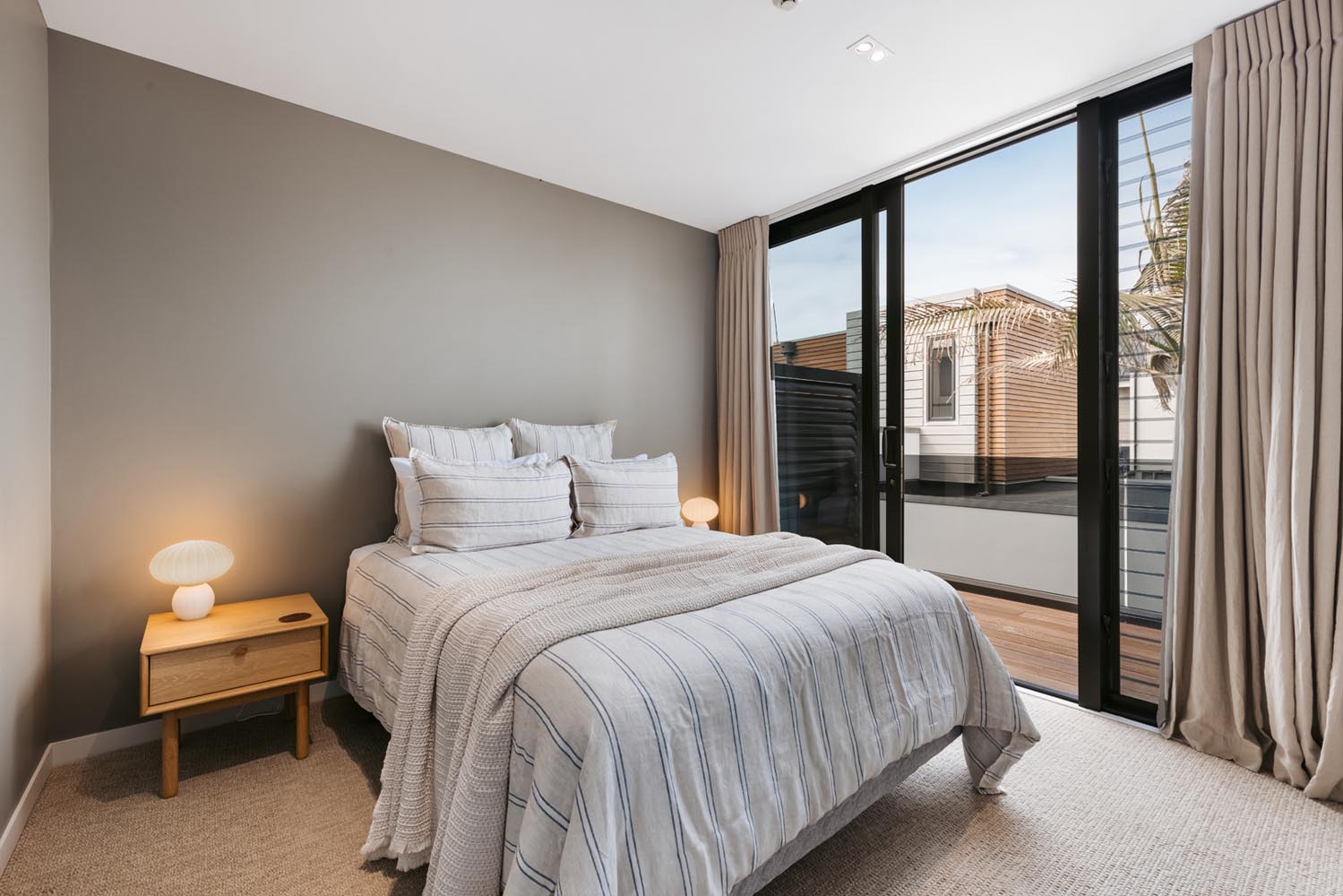 The sprawling open-plan living area gracefully envelops the central spacious kitchen on the middle floor, encircled by sweeping sea views that seem to go on forever. An oversized gas fireplace infuses just the right amount of ambiance. Immense floor-to-ceiling stacking slider doors at both the front and rear of the house can be flung wide open, crafting a heavenly sense of space, light, and elevation. A powder room and double bedroom sits comfortably with its own private deck.