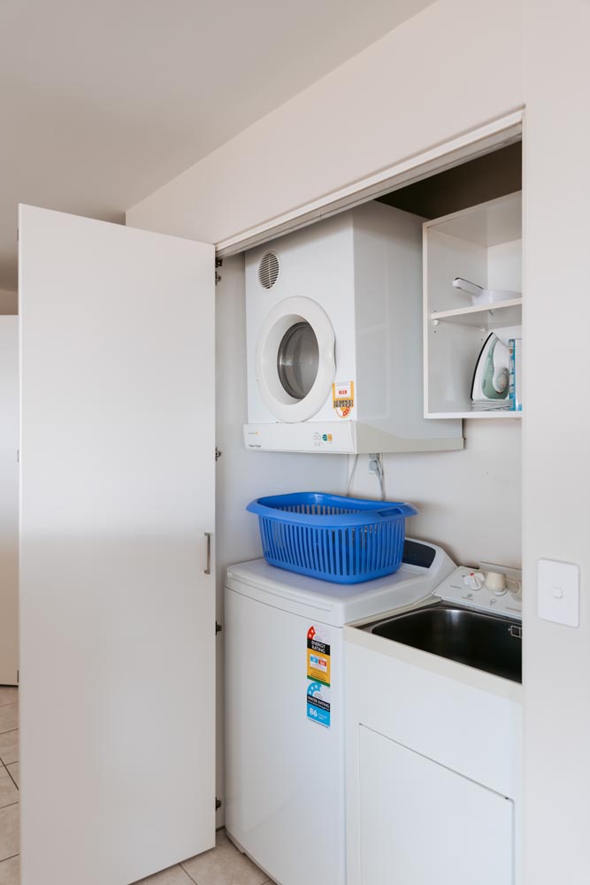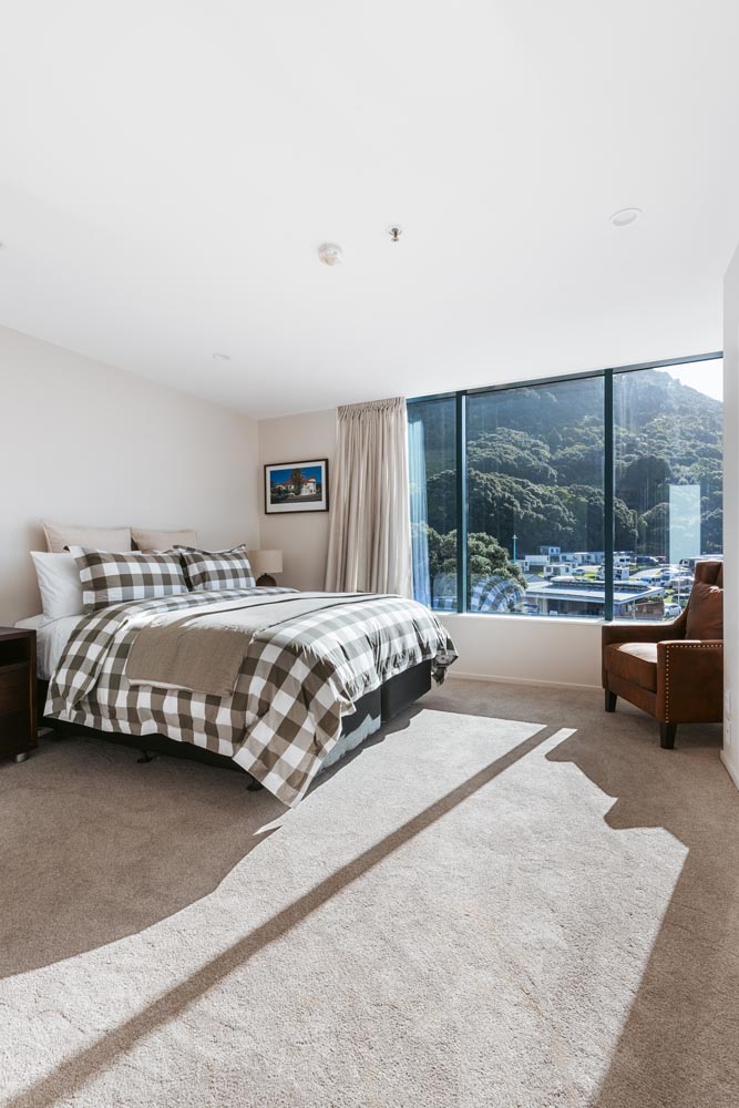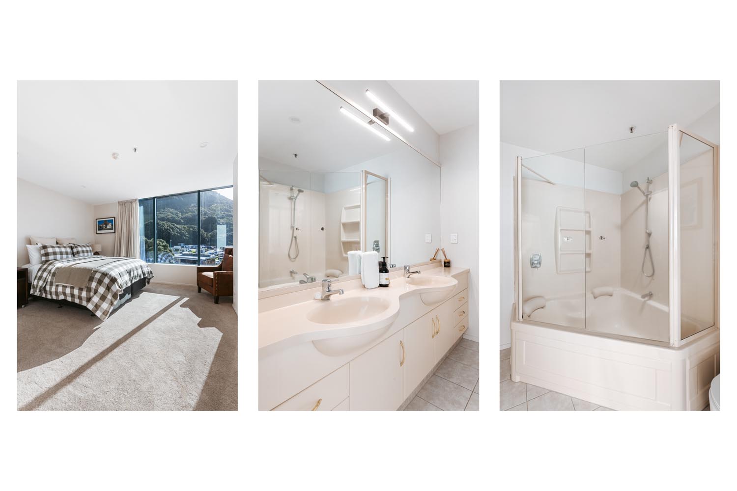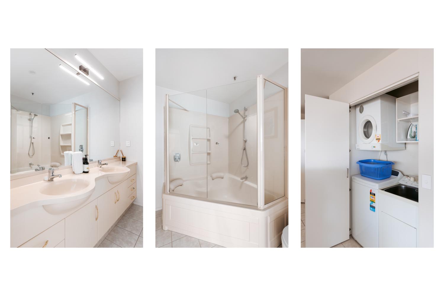 The master suite includes a plush king bed and ensuite with ocean and mountain views, while the second bedroom is ideal for friends or family, serviced by a separate full bathroom. A well-equipped kitchen, comfortable lounge, and in-room laundry add to the convenience.