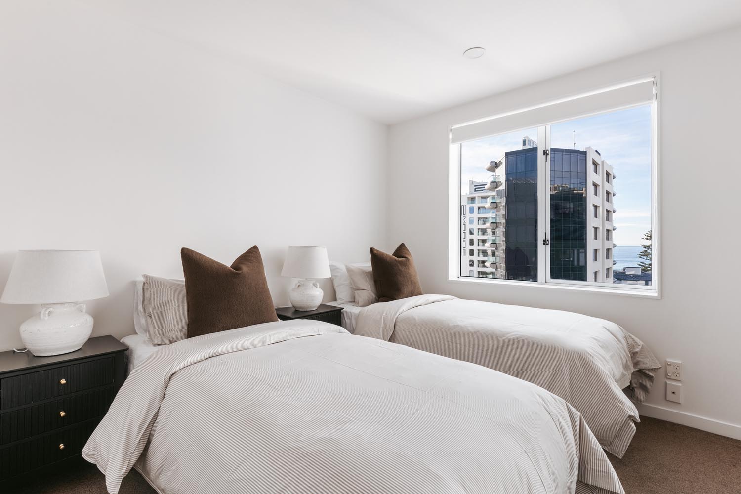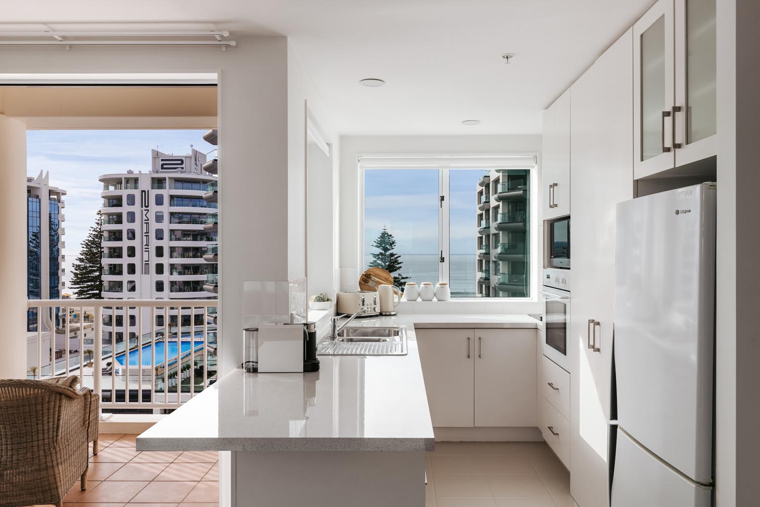 The master bedroom features a queen bed, ensuite, and breathtaking sea views. The second bedroom can be configured with either two singles or a king bed and also enjoys ocean glimpses. A second bathroom includes a full bathtub—ideal for unwinding after a day at the beach.