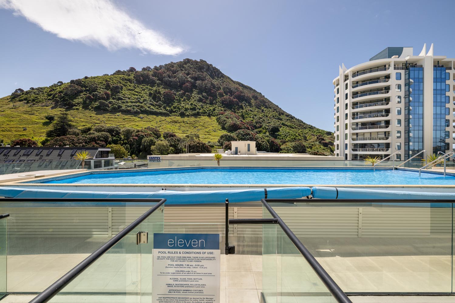 Fifth floor stunner with expansive views over Pilot Bay harbour and majestic Mauao. A luxury apartment complex, complete with heated outdoor pool, spa pool and private gym. Totally relax in this beautiful modern apartment simply but elegantly furnished. Complete with gorgeous kitchen, comfy lounge, office nook, two bathrooms and luxury linens. Once you’ve parked your car in the garage you might not need it again. Perfect location with Mount beach downtown Mount moments away.