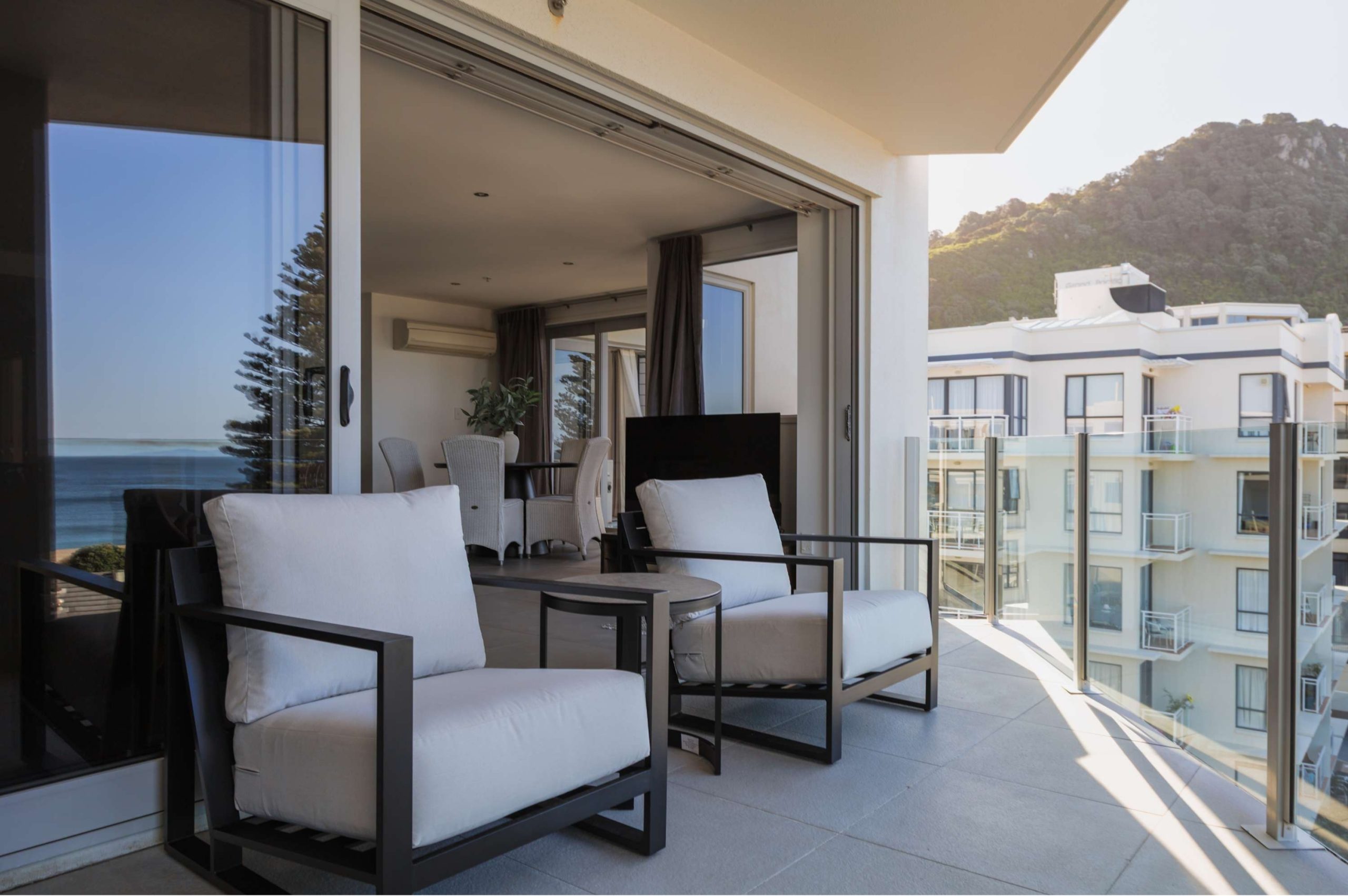 Sunlight streams into the home from morning to evening, enhancing its elegant interiors and highlighting the elevated sense of calm and style. From the living spaces and balcony, enjoy divine panoramic views across the sparkling coastline and the vibrant Mount landscape, the kind of outlook that transforms every moment.